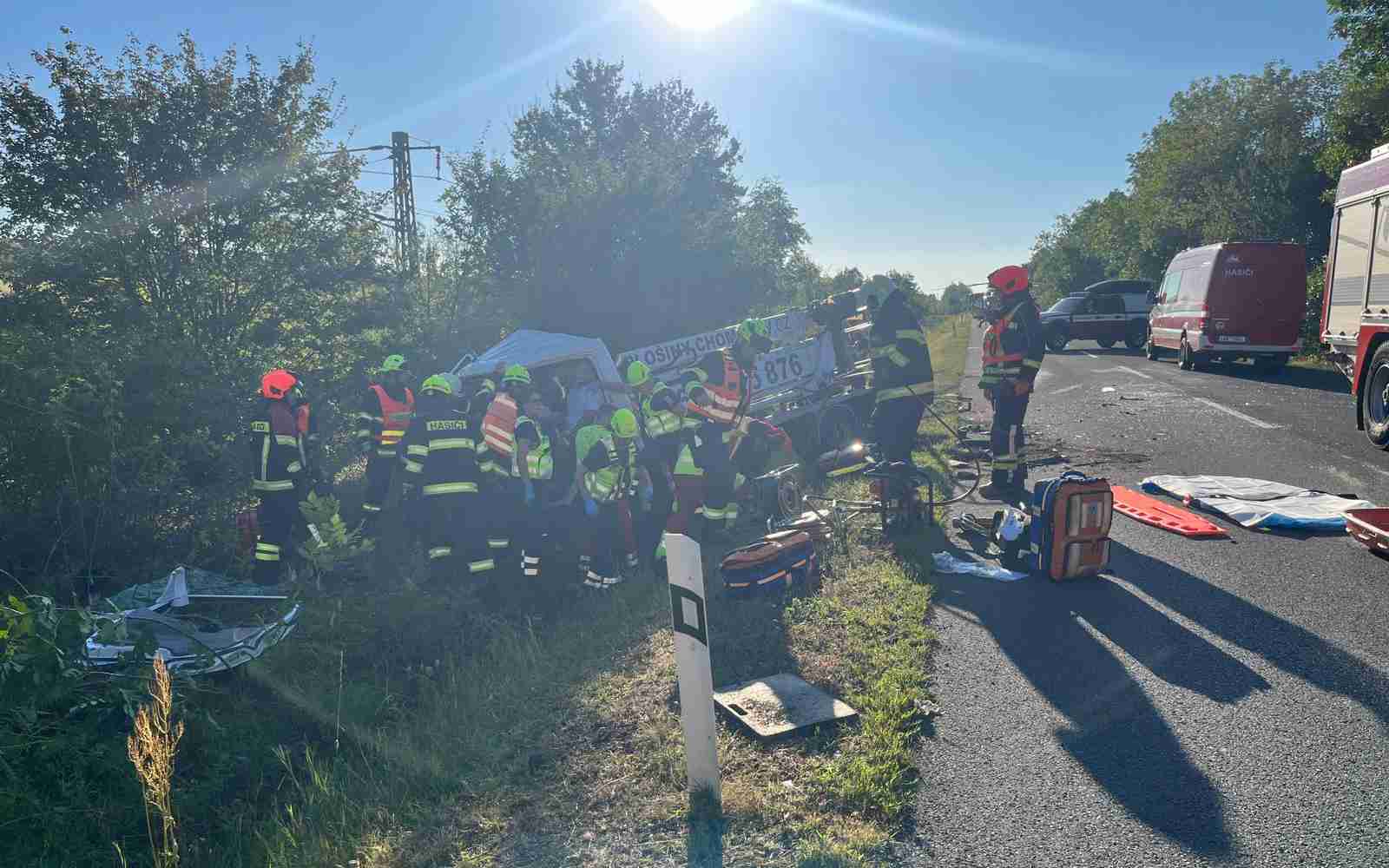 Nehoda se podle policistů měla stát tak, že za sebou jely dvě plošiny. První se zaparkované dodávce u krajnice vyhnula, druhá do auta nabourala. Řidič plošiny zůstal zaklíněný ve voze, zaparkované dodávce nikdo nebyl.