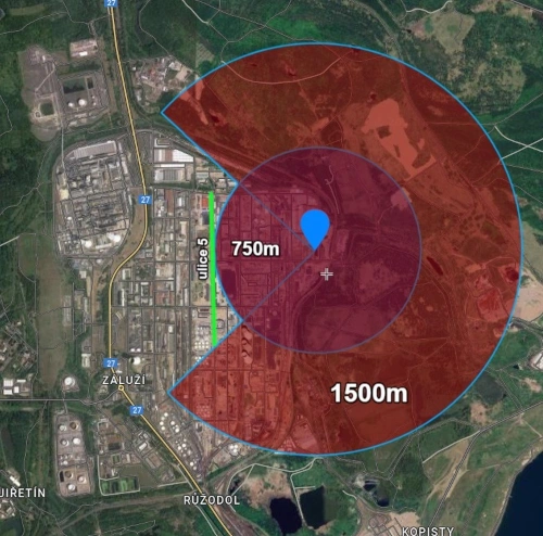 Záluží - Město Most žádá obyvatele, aby nevstupovali do perimetru vyznačeného pyrotechnikem. Podle policie jsou razantní opatření na místě. Důvodem je nepředvídatelnost iniciace letecké pumy, která má v sobě dlouhodobý chemický zapalovač. Ten může být nastaven až na 144 hodin, tedy 6 dní.