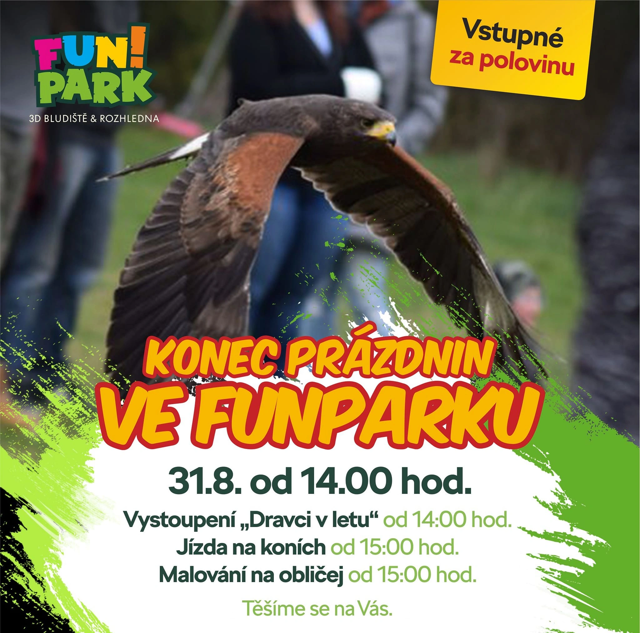 „Ve Funpark Most, kde najdete 3D bludiště a rozhlednu, se v sobotu 31. srpna rozloučíme s prázdninami. Od 14 hodin se můžete těšit na "DRAVCE V LETU", kdy se vám představí 13 druhů dravců a několik z nich uvidíte dokonce v akci. Chybět nebudou jízdy na koních a malování na obličej," láká město Most do svého zábavního areálu.