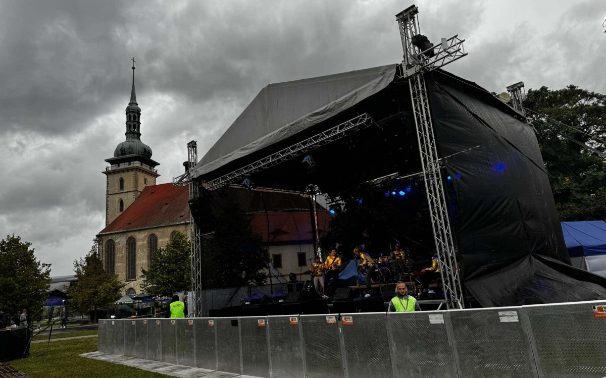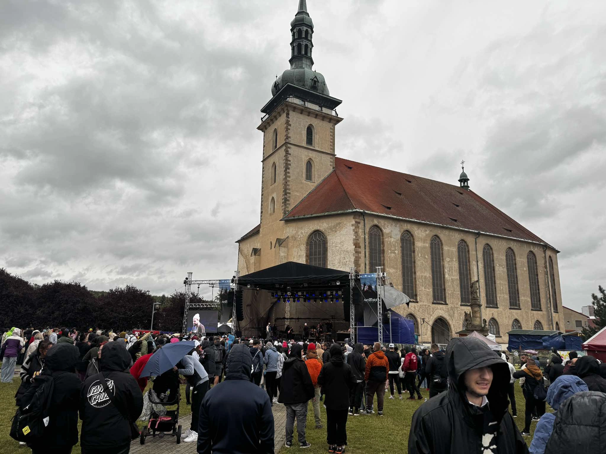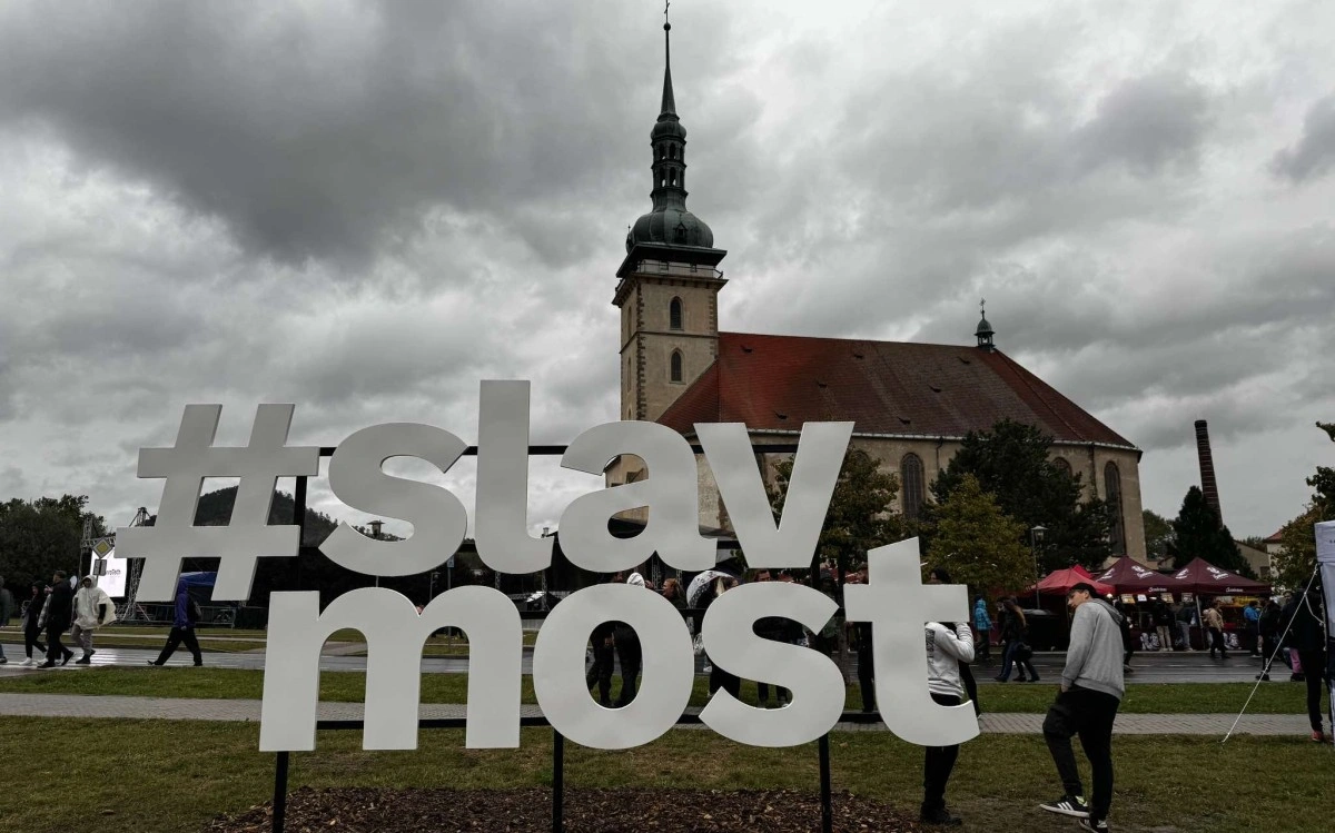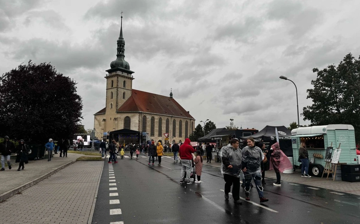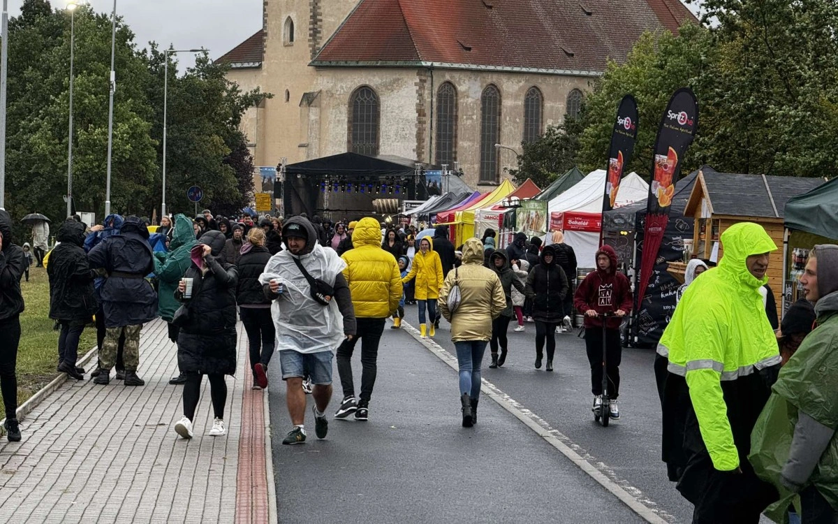 Most – Prší, fouká vítr, ale v porovnání se zbytkem republiky je vlastně u Děkanského kostela pohoda. Mostečané se nenechali odradit. Podívejte se, jak vypadá první den Mostecké slavnosti.