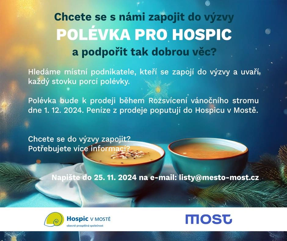 „Hledáme podnikatele, kteří by byli ochotni uvařit sto porcí polévky a věnovat ji na tuto dobročinnou akci. Ta pak bude k zakoupení v neděli 1. prosince 2024 od 15 hodin během akce Rozsvícení vánočního stromu pod ochozem magistrátu. O výdej polévky se postarají pracovníci magistrátu a zaměstnanci Městské správy sociálních služeb v Mostě. Na podnikatelích by byla podpora formou nakoupení surovin a uvaření polévky. Vybrané peníze z prodeje poputují do Hospicu v Mostě," popisuje záměr akce mluvčí města Klára Vydrová.