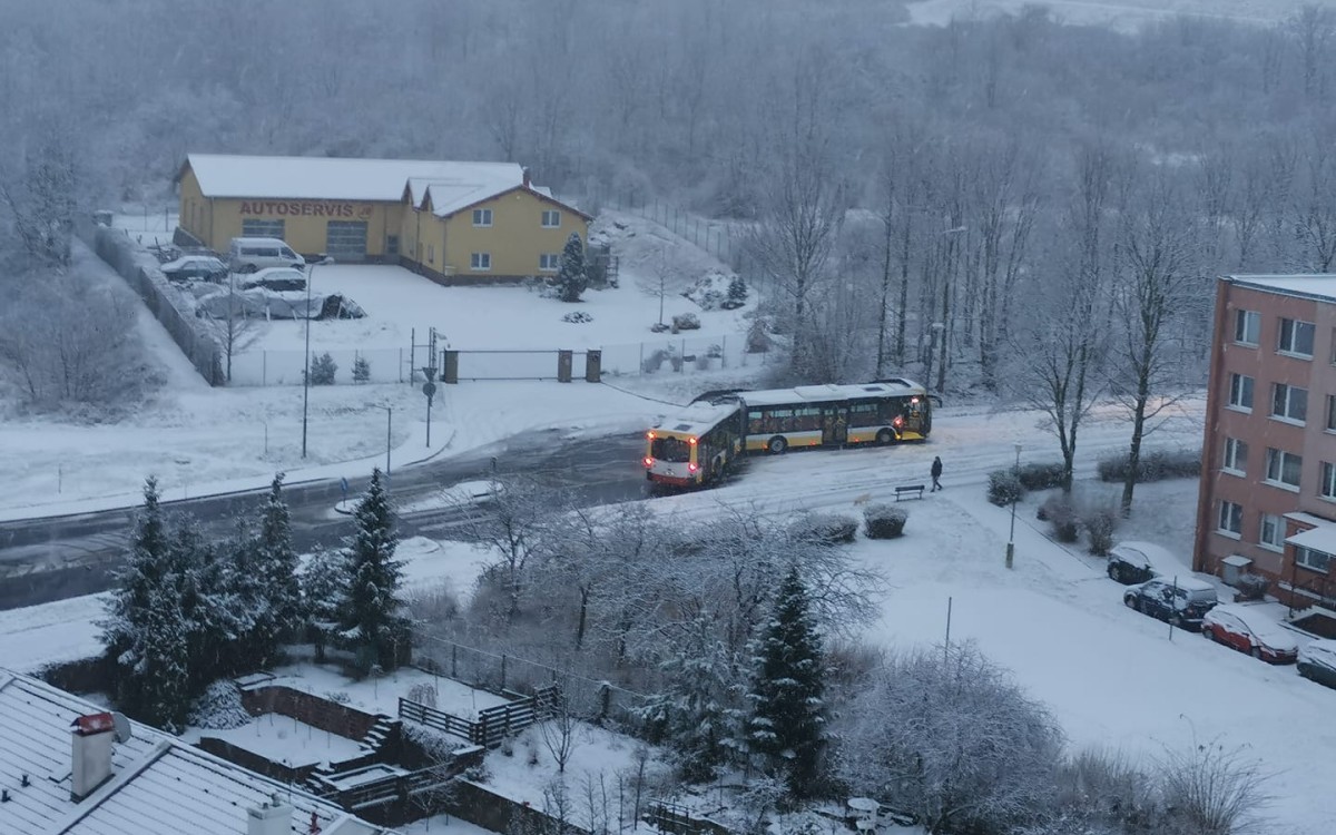 Mostecko – První větší sněžení této zimy způsobuje dopravní komplikace po celém Ústeckém kraji, a to nejen v horských úsecích, ale i ve větších stoupáních ve městech. V Mostě u Krymu silnici zablokoval kloubový autobus, což ovlivňuje další spoje hromadné dopravy.