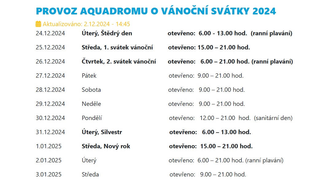 Aquadrom bude mít, jako každý rok, i speciálně upravenou otevírací dobu během vánočních svátků.