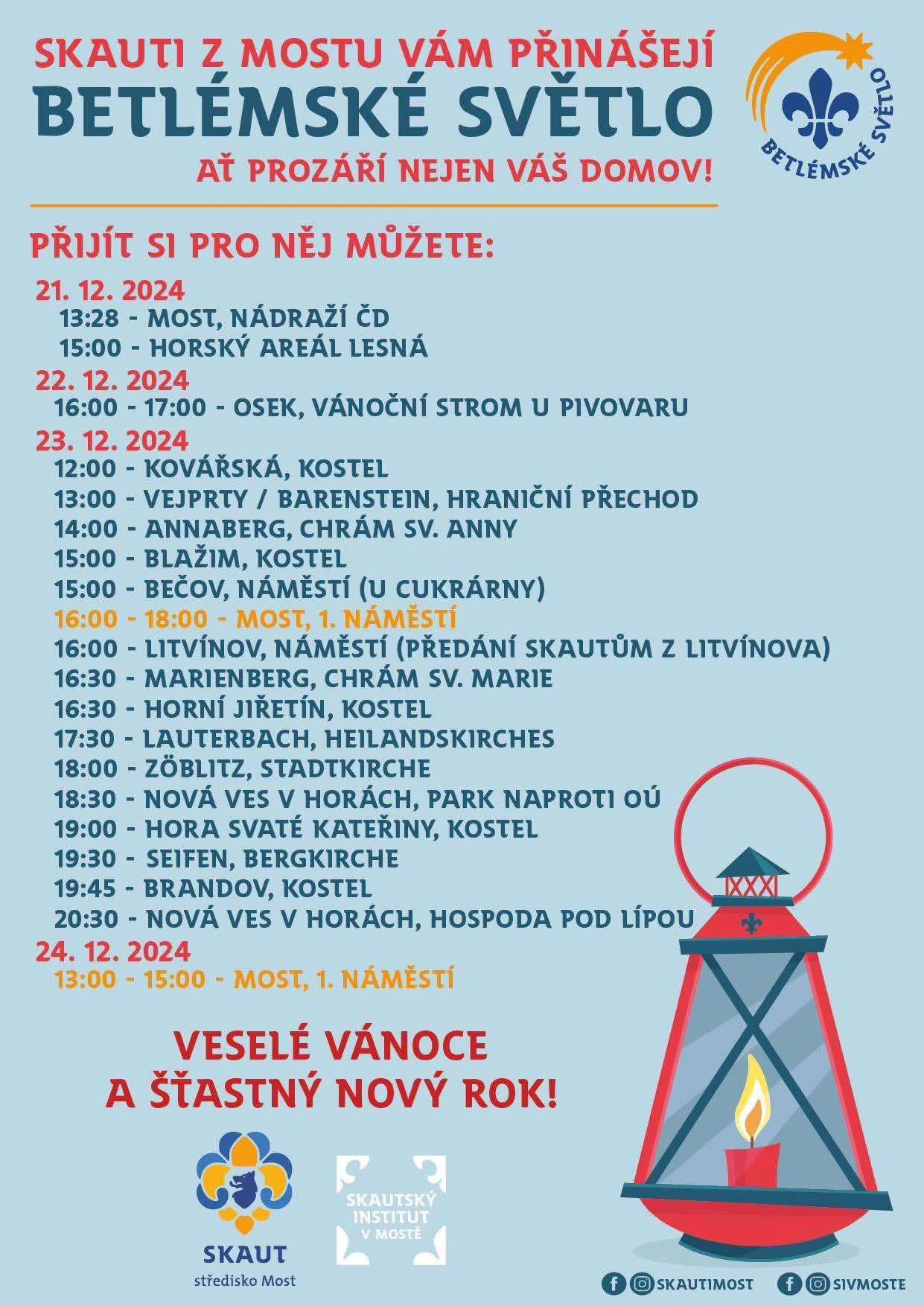 Mostecko – Skauti ze střediska Most v sobotu 21. prosince přivezou na mostecké vlakové nádraží Betlémské světlo. Vlak do stanice dorazí ve 13.28 minut. Postupně jej rozvezou do ostatních měst a obcí. V rámci programu čtvrtého adventu, bude již v sobotu k dostání i na Lesné.