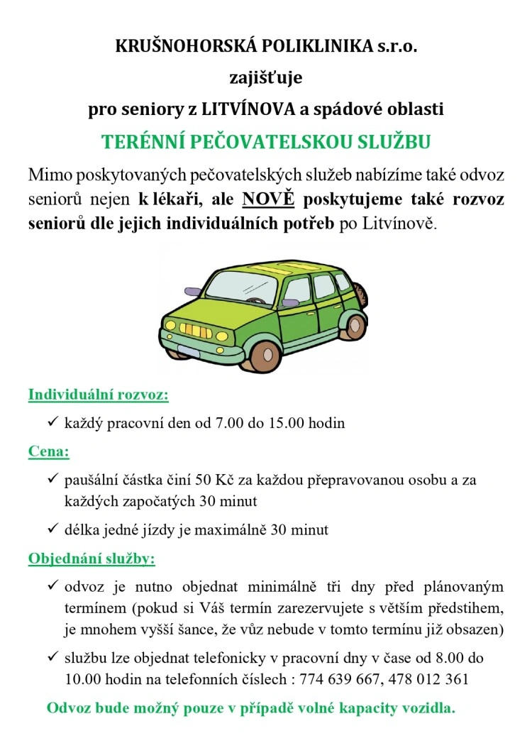Litvínovští senioři zatím využívají odvoz k lékaři ve městě, případně k lékaři do Mostu, přičemž cesta stojí 50 korun. „Stejně jako je tomu u mosteckého Taxíku Maxíku, je potřeba si jízdu zarezervovat předem, bohužel nejsme schopni zajistit vůz ve chvíli, kdy někdo ráno zavolá, že ten den potřebuje odvézt,“ dodala Květuše Hellmichová.