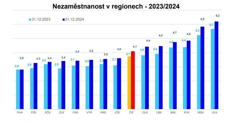 Nejvyšší podíl nezaměstnaných osob byl v prosinci v Ústeckém kraji (6,2 %) a Moravskoslezském kraji (5,8 %). Tyto regiony měly nejvyšší podíl nezaměstnaných osob ve stejném období i loni.
