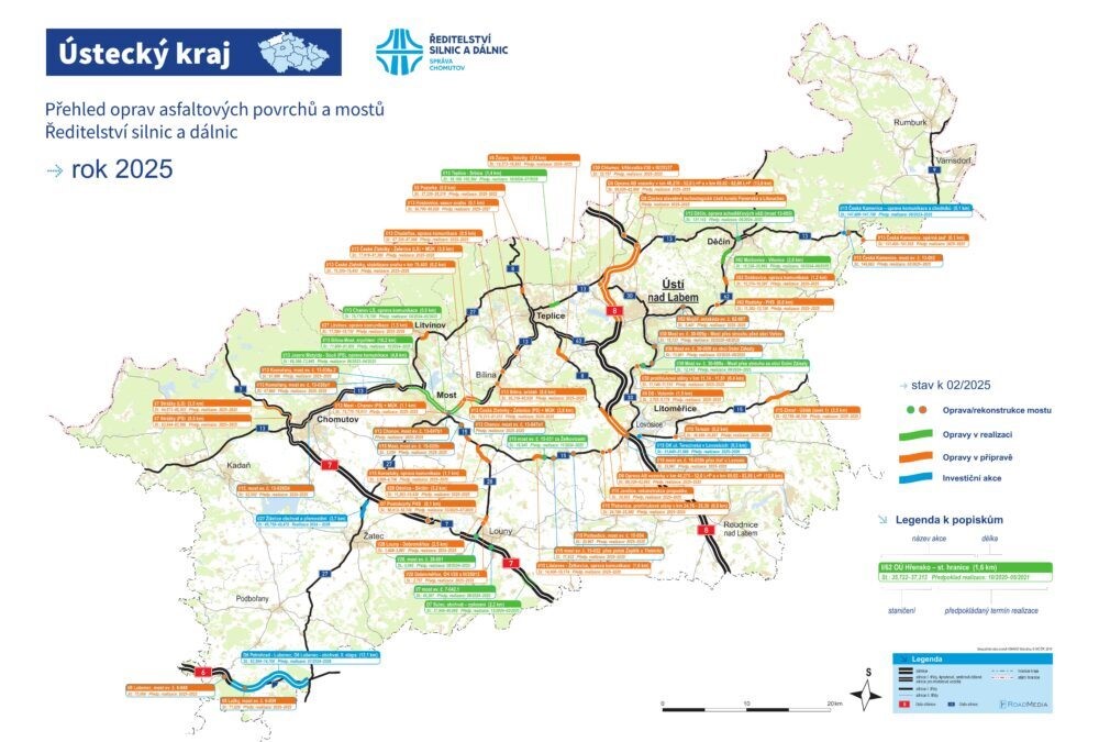 Ústecký kraj – Oprava mostků na I/13 u jezera Matylda, dalšího mostku na I/15 u Sedlece, přestavba křižovatky u Šmelce poblíž Chlumce, pokračování stavby mostu u Žiželic či modernizace tunelů na dálnici D8 směrem na Německo. Ředitelství silnic a dálnic České republiky (ŘSD) zveřejnilo mapu oprav silnic v Ústeckém kraji pro rok 2025.