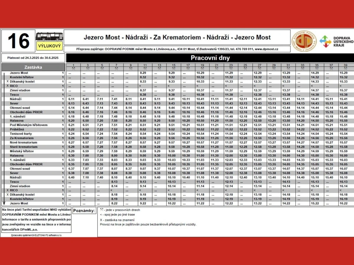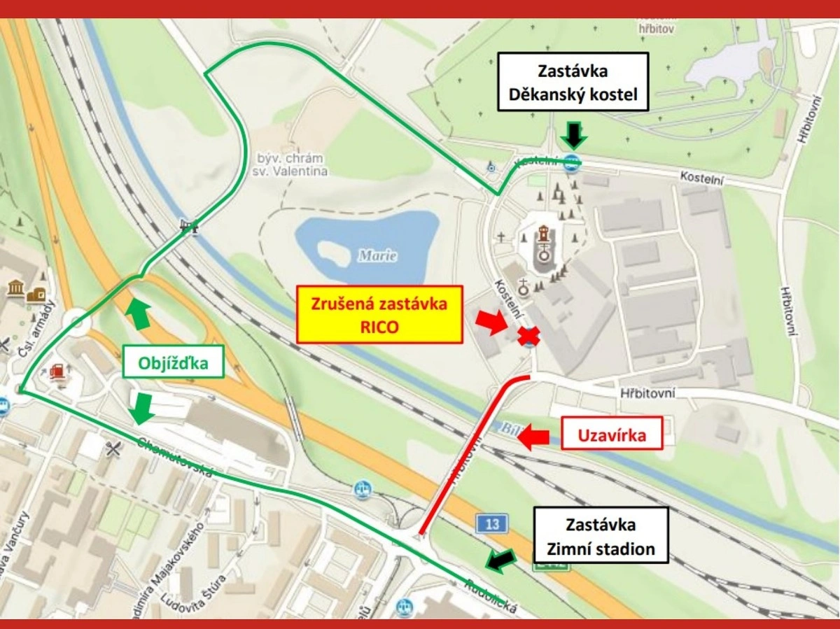 „Po celou dobu uzavírky bude v obou směrech zrušena pro linku číslo 16 zastávka "RICO". Nebližší náhradní zastávky budou Děkanský kostel nebo Zimní stadion," uvádí DOPRAVNÍ PODNIK měst Mostu a Litvínova.