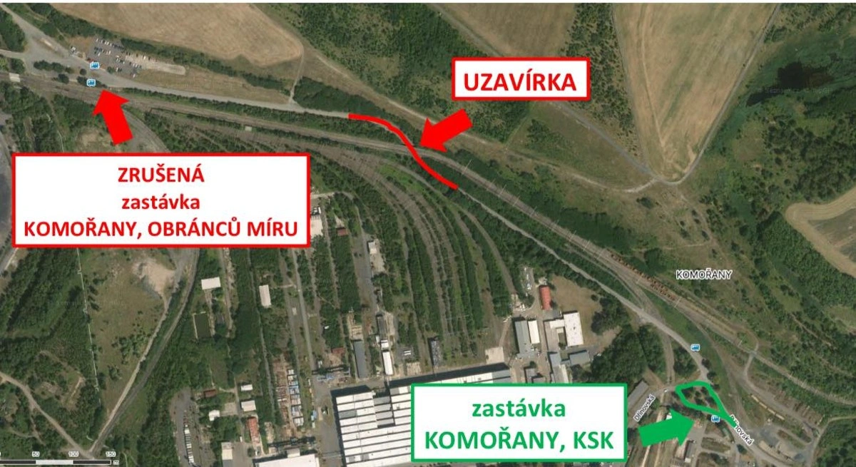 Náhradou za zrušenou zastávku Komořany, Obránců míru budou po celou dobu uzavírky vybrané spoje linky č. 12 odkloněny do bývalé zastávky Ervěnice, záv. ČSA a to následovně.