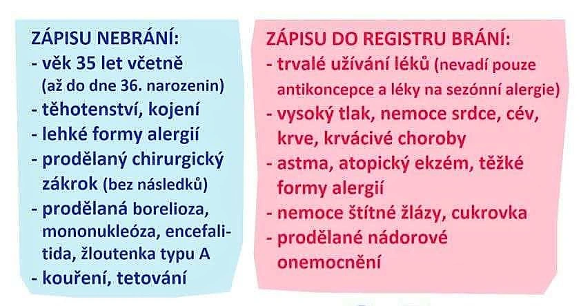 Zaregistrovat se může každý zdravý člověk ve věku 18 do 35 let včetně. (V ČR jsou dva registry – registr dárců kostní dřeně a registr dárců krvetvorných buněk, do něhož mohou vstupovat zájemci až do věku 40 let - pozn. redakce). Je potřeba mít alespoň 50 kg a neužívat pravidelně žádné léky s výjimkou antikoncepce. V registru zůstávají dárci do 60 let. Český národní registr dárců dřeně právě včera zveřejnil fotku Lukáše, které patřil mezi tu hrstku lidí, že se u něj našla shoda s pacientem. „Já vím, netvářím se úplně šťastně, ale opravdu jsem! Klidně použijte moje fotky, aby ostatní věděli, že darování kostní dřeně není nic hrozného a nebáli se vstoupit,“ zní výpověď Lukáše u fotek. Co v průběhu odběru dělal, si můžete přečíst ZDE.