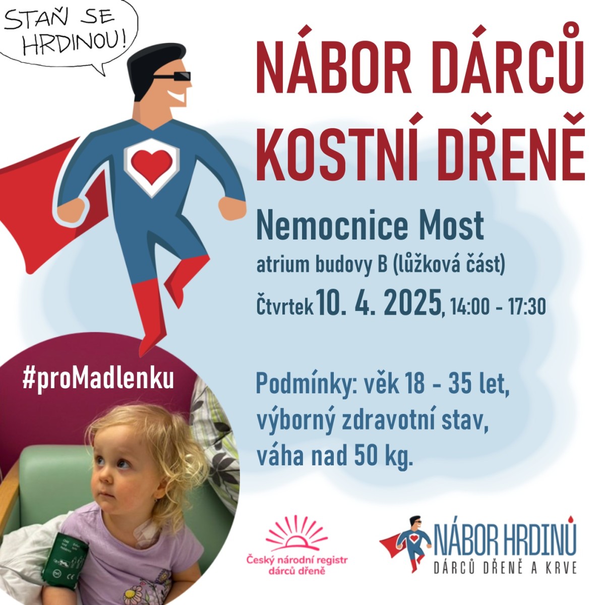Most – Ve čtvrtek 10. dubna budou mít i v Mostě lidé mimořádnou příležitost vstoupit do registru dárců kostní dřeně. Opět jde o akci s podtitulem #proMadlenku. Tentokrát dobrovolníci Českého národního registru dárců dřeně dorazí do atria budovy B mostecké nemocnice. Nábor se koná od 14 do 17.30 hodin. Na místě neprobíhá žádný odběr krve, pouze se provádí stěr z úst štětičkou.