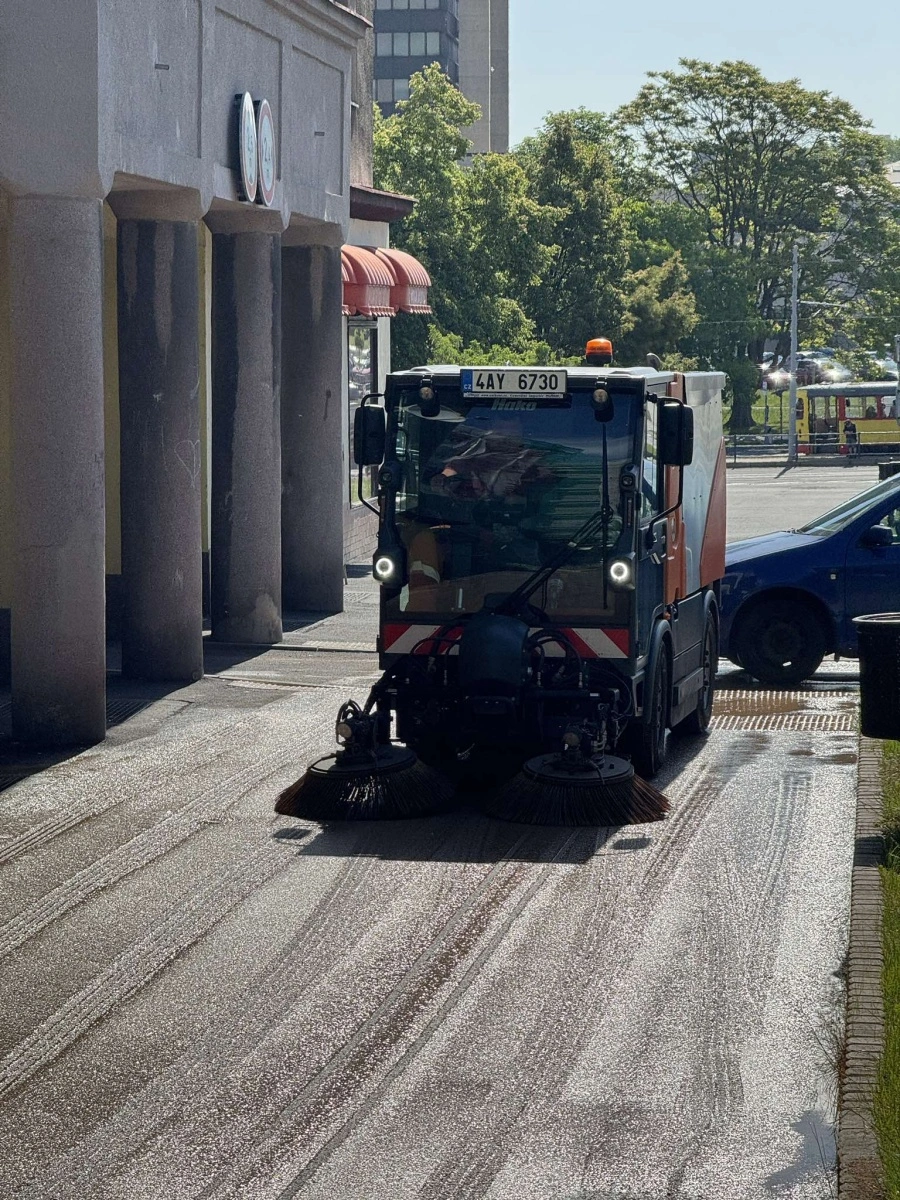 Unikající voda se valila až k třídě Budovatelů. Její únik se již podařilo zastavit a do ulic okamžitě vyjel čisticí vůz.