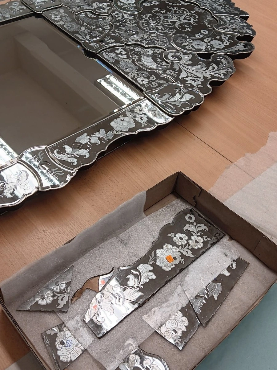 Most – Restaurování historického zrcadla benátského typu dokončeno! Jedinečné zrcadlo z 18. století ze sbírek Oblastního muzea a galerie v Mostě prošlo náročnou obnovou, která vrátila lesk skleněné kráse s královskou korunou i rytým monogramem.