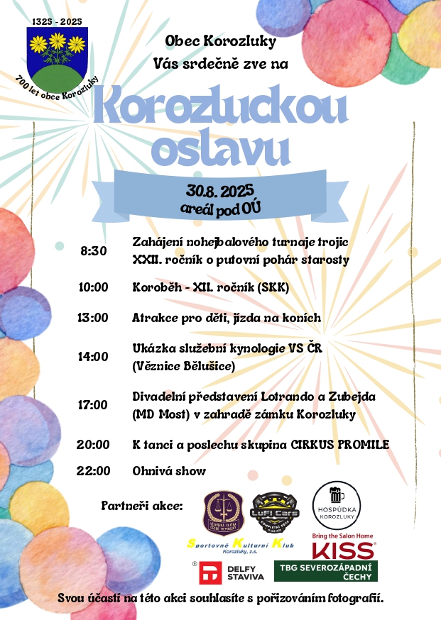 Korozluky – Vesnička jihovýchodně od Mostu má letos skutečný důvod k radosti. Od první písemné zmínky o její existenci uplynulo 700 let a významné jubileum si obec připomíná řadou akcí po celý rok. Ta hlavní obecní oslava se ovšem uskuteční tuto sobotu 30. srpna.