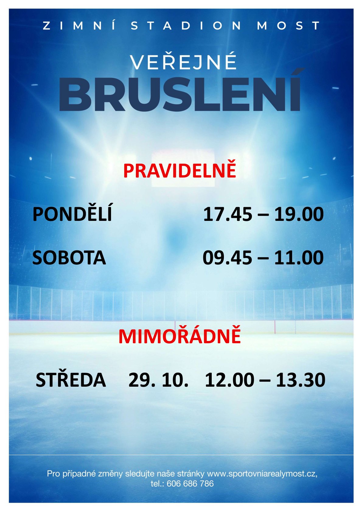Pravidelně si mohou zájemci zabruslit na zimním stadionu každé pondělí večer od 17:45 do 19:00 a v sobotu dopoledne od 9:45 do 11:00.
