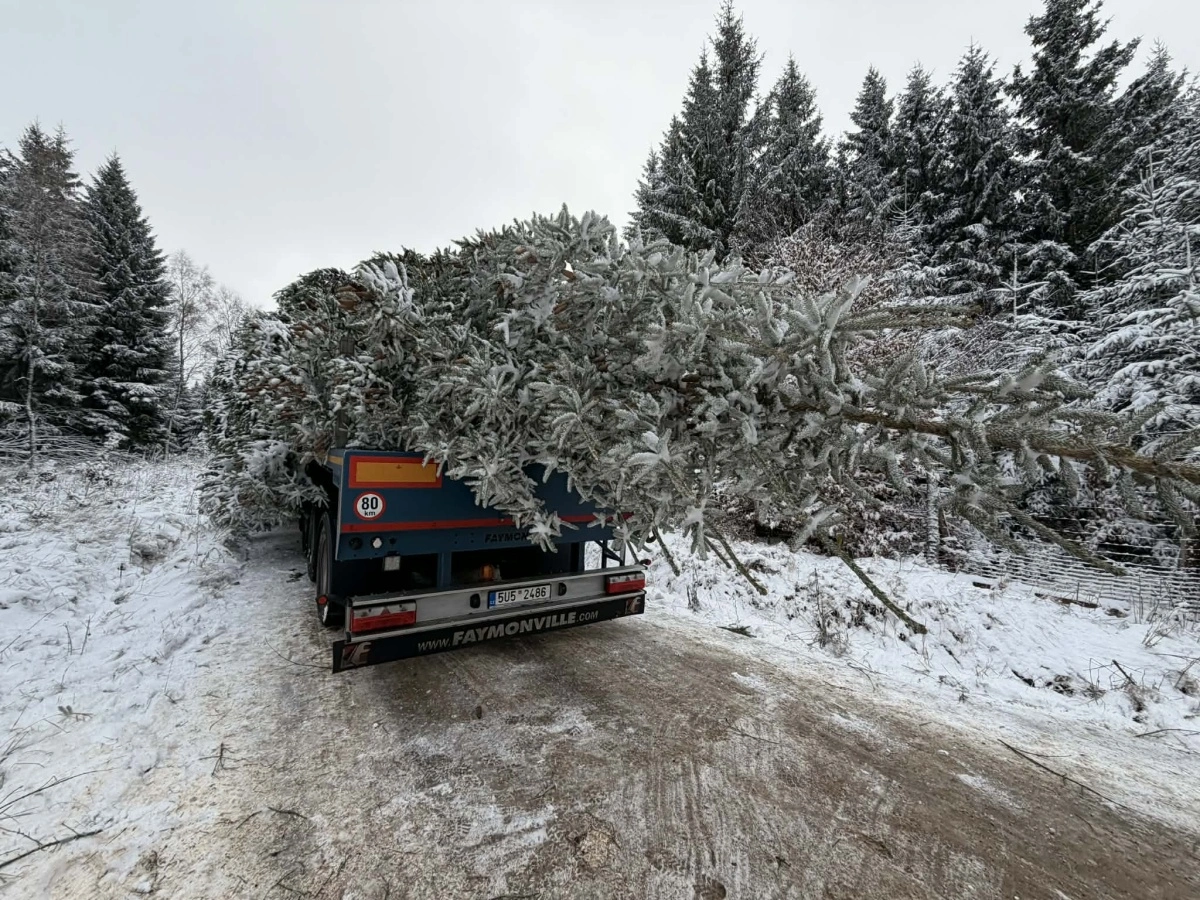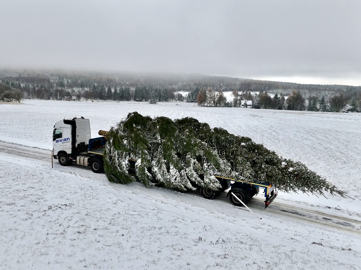 Krátce po dvanácté hodině nákladní vůz přivezl strom do centra města. Ve čtvrt na dvě ho pracovníci za pomoci jeřábu vztyčili a dokončovali jeho ukotvení.