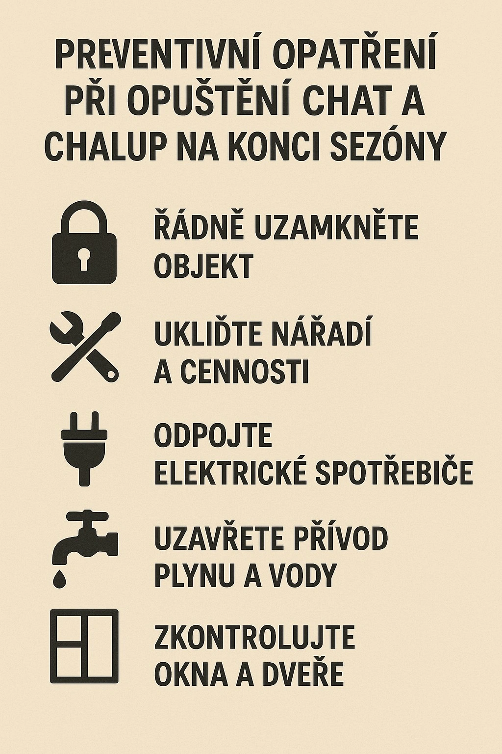 Policie však připomíná, že hlídky nemohou být všude. „Není možné těmito kontrolami zcela obsáhnout veškeré rekreační oblasti a objekty, kdy zodpovědnost za svůj majetek a za jeho řádné zabezpečení, přeci jen leží v rukou samotných chatařů a chalupářů,“ zdůrazňuje Tomáš Frolík.