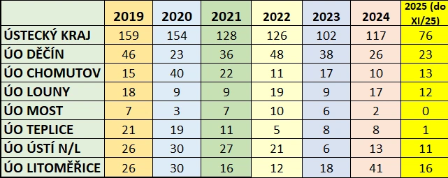 Mostecko se tak stalo nejbezpečnějším okresem v celém Ústeckém kraji. Pro srovnání – na Děčínsku už policisté letos řešili 23 případů a na Litoměřicku 16. Pozitivní trend je na Mostecku patrný dlouhodobě. Zatímco v roce 2022 zde zloději udeřili desetkrát, loni to byly už jen dva případy a letos zatím žádný.
