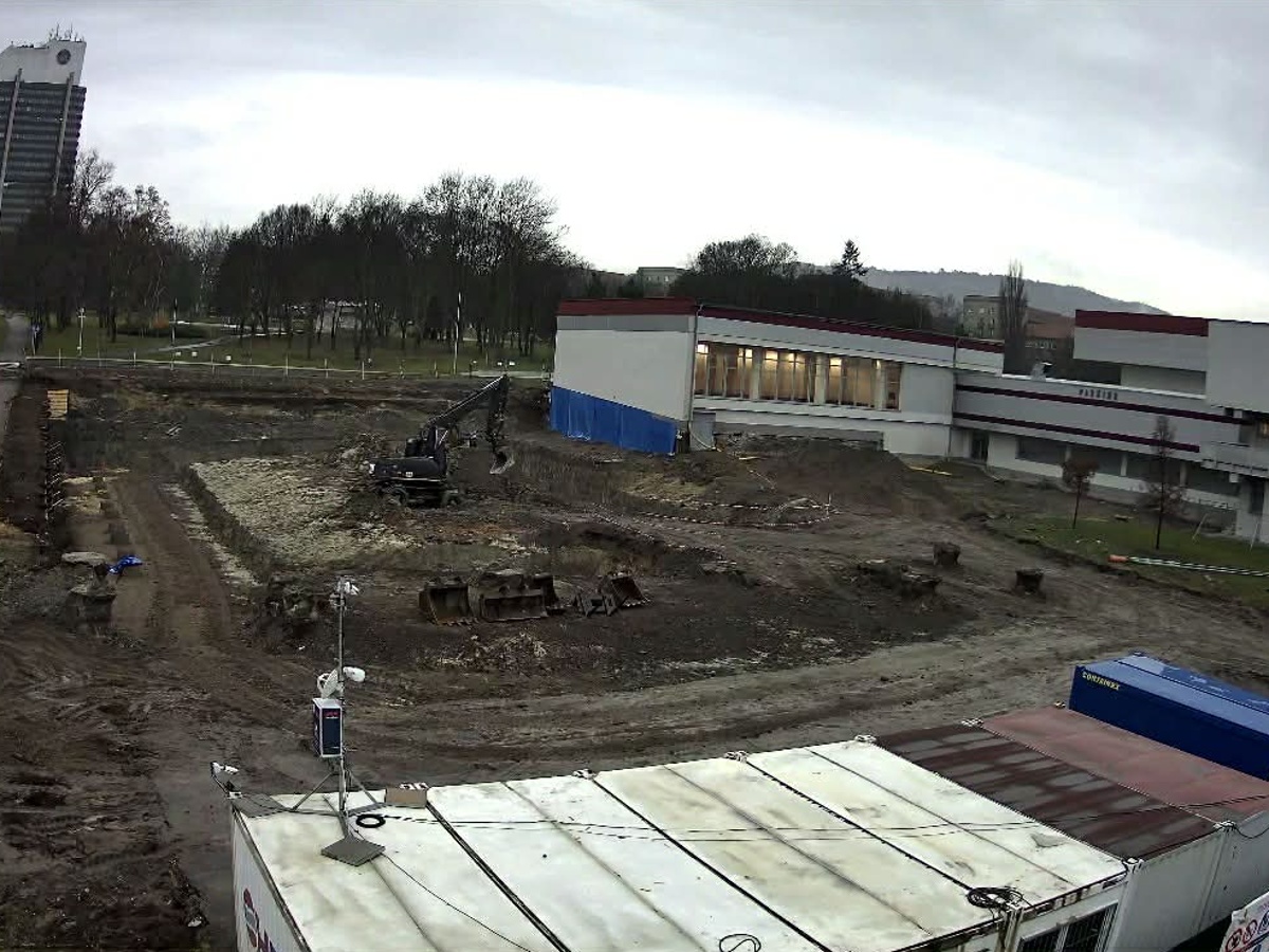 Aktuálně na staveništi probíhají zemní práce a zakládání stavby. Harmonogram však dostává trhliny. „Je tam zpoždění v řádu týdnů. Na začátku byl problém s komunikací mezi halou a parkem Střed, tím se ztratily tři týdny. Teď se tam řeší spodní voda, která stéká shora z parku,“ popsal komplikace primátor Marek Hrvol.