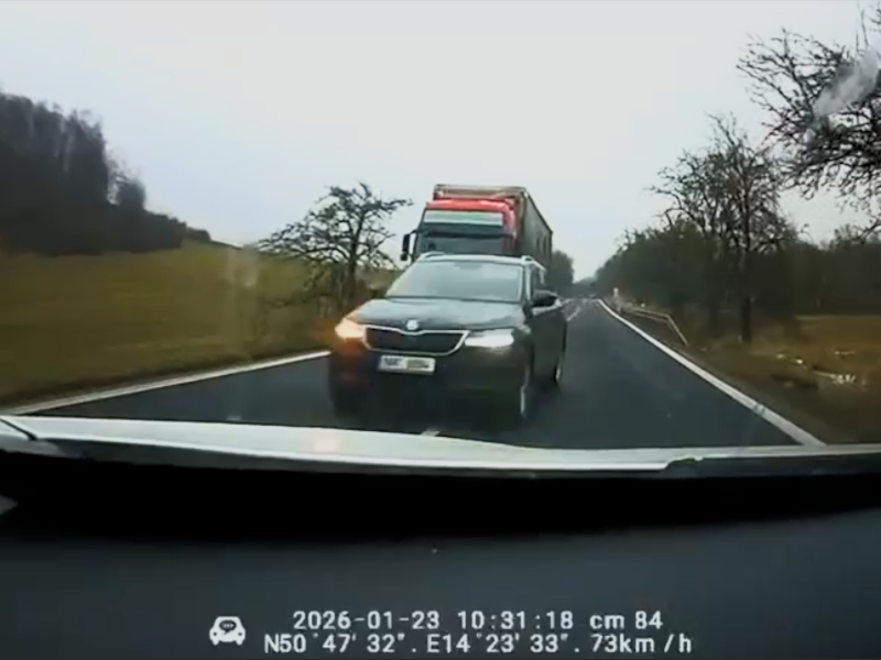 Děčínsko – Na silnici I/13 mezi Děčínem a Českou Kamenicí byla 23. ledna pořízena palubní kamerou nahrávka, která zachycuje nebezpečné předjíždění. Na záznamu z palubní kamery je vidět, jak řidič protijedoucího osobního auta předjíždí kamion a jen těsně se přitom vyhne vozidlu, jehož řidič nám záznam zaslal. Ten musel prudce brzdit, jinak by nejspíš došlo k čelnímu střetu, za sebou měl přitom ještě vlek. Následky tak mohly být fatální.