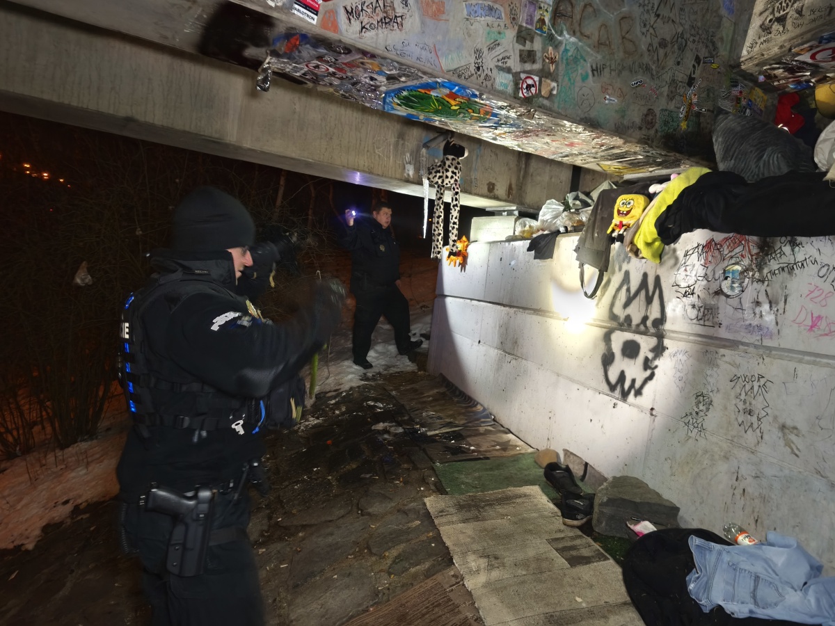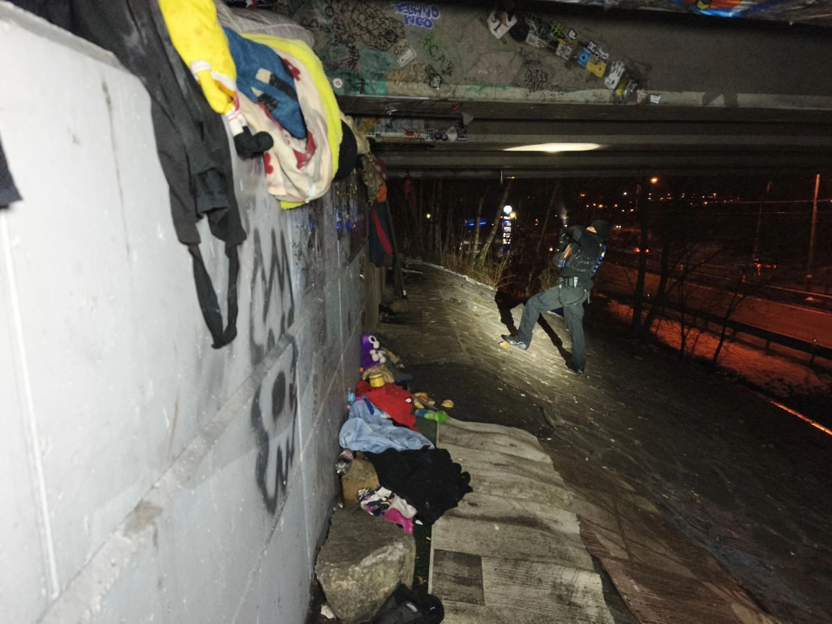 Při večerní kontrole v pátek 20. února se hlídka zaměřila na prostor pod silničním mostem u přemostění silnice I/13. Ačkoliv nebyl nikdo zastižen přímo na místě, stopy po přespávání a pobytu osob bez domova byly zcela zřetelné. Největší hrozbu představuje strmý betonový sráz, který je ve vlhkém či chladném počasí velmi kluzký. V lokalitě, sevřené v obou směrech čerpacími stanicemi, řidiči s něčím takovým vůbec nepočítají, protože sem chodci nemají téměř přístup, a reakční doba na případný pád osoby ze svahu by byla i při dodržení rychlosti minimální.