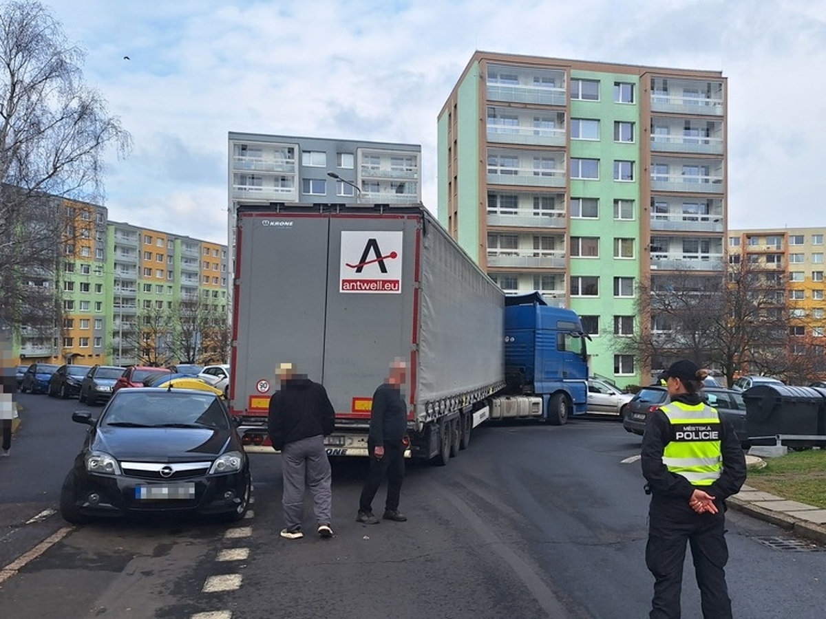 Situaci na místě musela okamžitě řešit přivolaná motohlídka strážníků. „Kamion zabloudil do Sedmistovek. Aby se odsud dostal, strážníci museli zorganizovat odtah a přeparkování několika aut,“ uvedla k rannímu incidentu mluvčí mosteckých strážníků Veronika Bohuslavová. Bylo totiž nad slunce jasné, že bez radikálního uvolnění prostoru se tato souprava z pasti vlastními silami nedostane.
