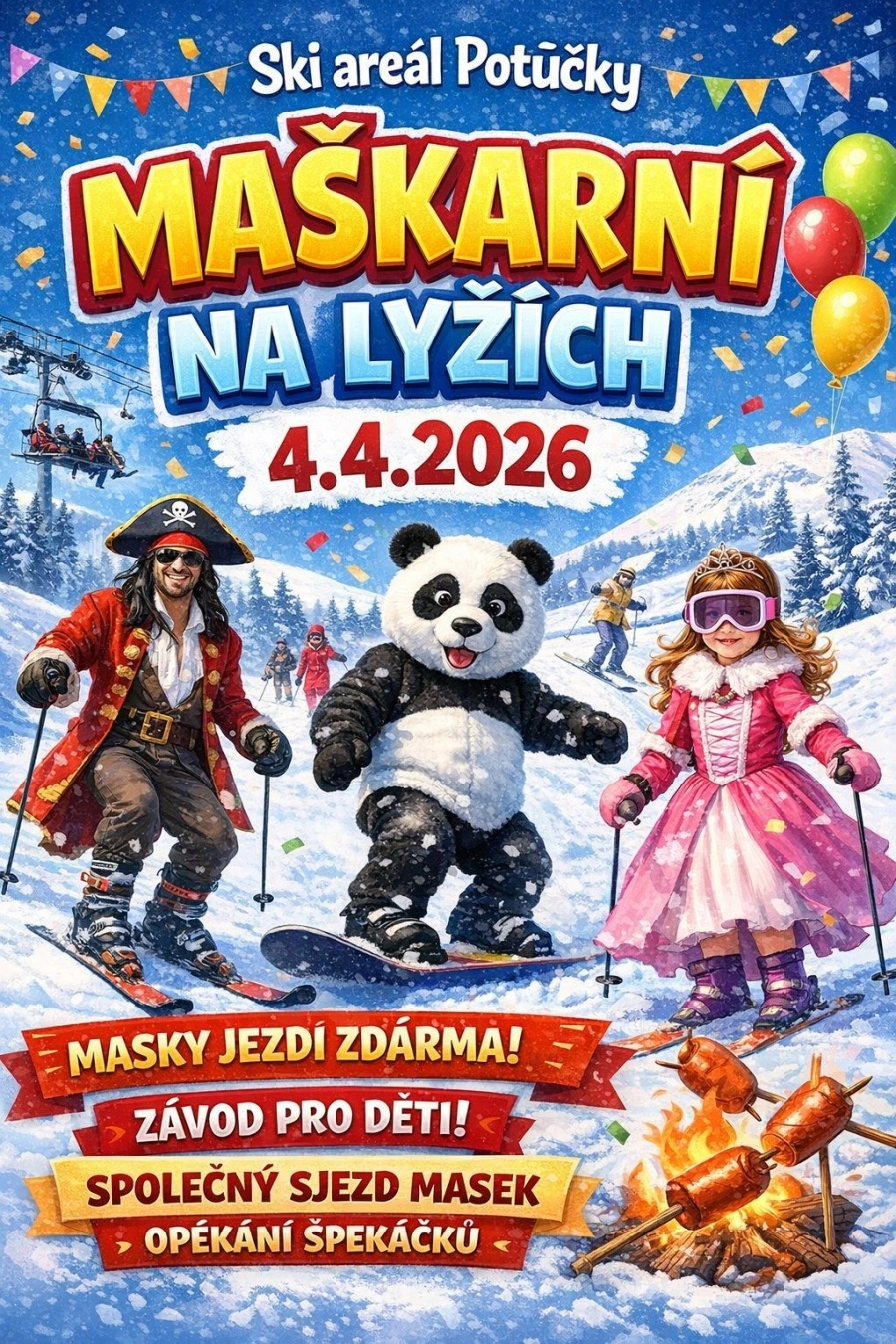 V Potůčkách mají sněhu momentálně tolik, že by podle jejich vlastních slov "mohli lyžovat i v květnu." Zda se tento odvážný plán naplní, bude záležet především na zájmu lyžařů. Každopádně nejbližší akce, Maškarní na lyžích, naplánovaná na tuto sobotu 4. dubna, slibuje sjezd masek zdarma, dětský závod a opékání špekáčků, to vše na hromadách čerstvého sněhu.