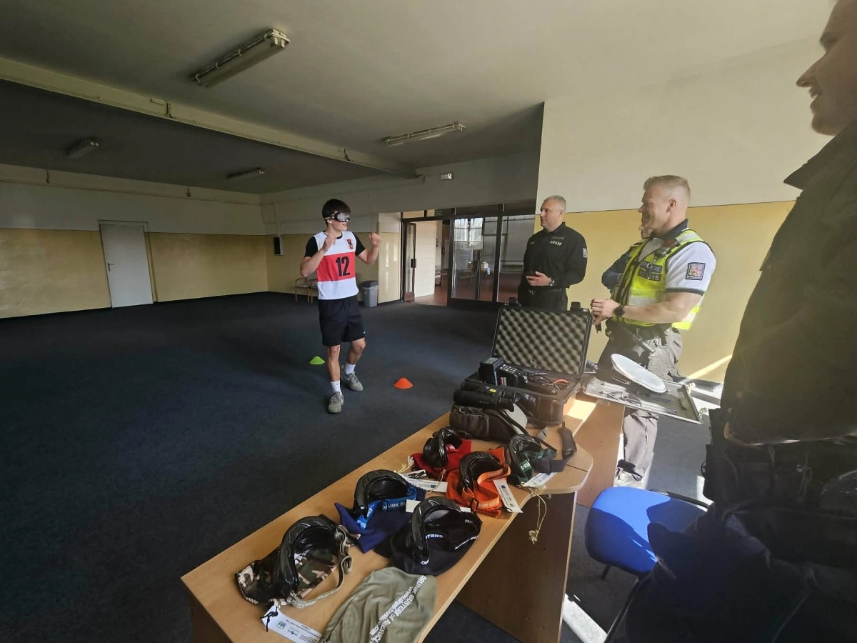 Kromě sportování měli studenti možnost nahlédnout i do policejní praxe. Policisté jim ukázali výstroj, zastavovací pásy i nový dalekohled pro odhalování nepozorných řidičů. Velkým lákadlem byly také speciální brýle navozující pocit opilosti nebo ovlivnění drogami.