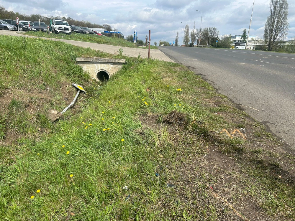 Nehodu připomínají také výrazné stopy na vozovce, poškozené dopravní značení a další následky prudkého nárazu. Na místě je patrné, jak silný střet musel být.