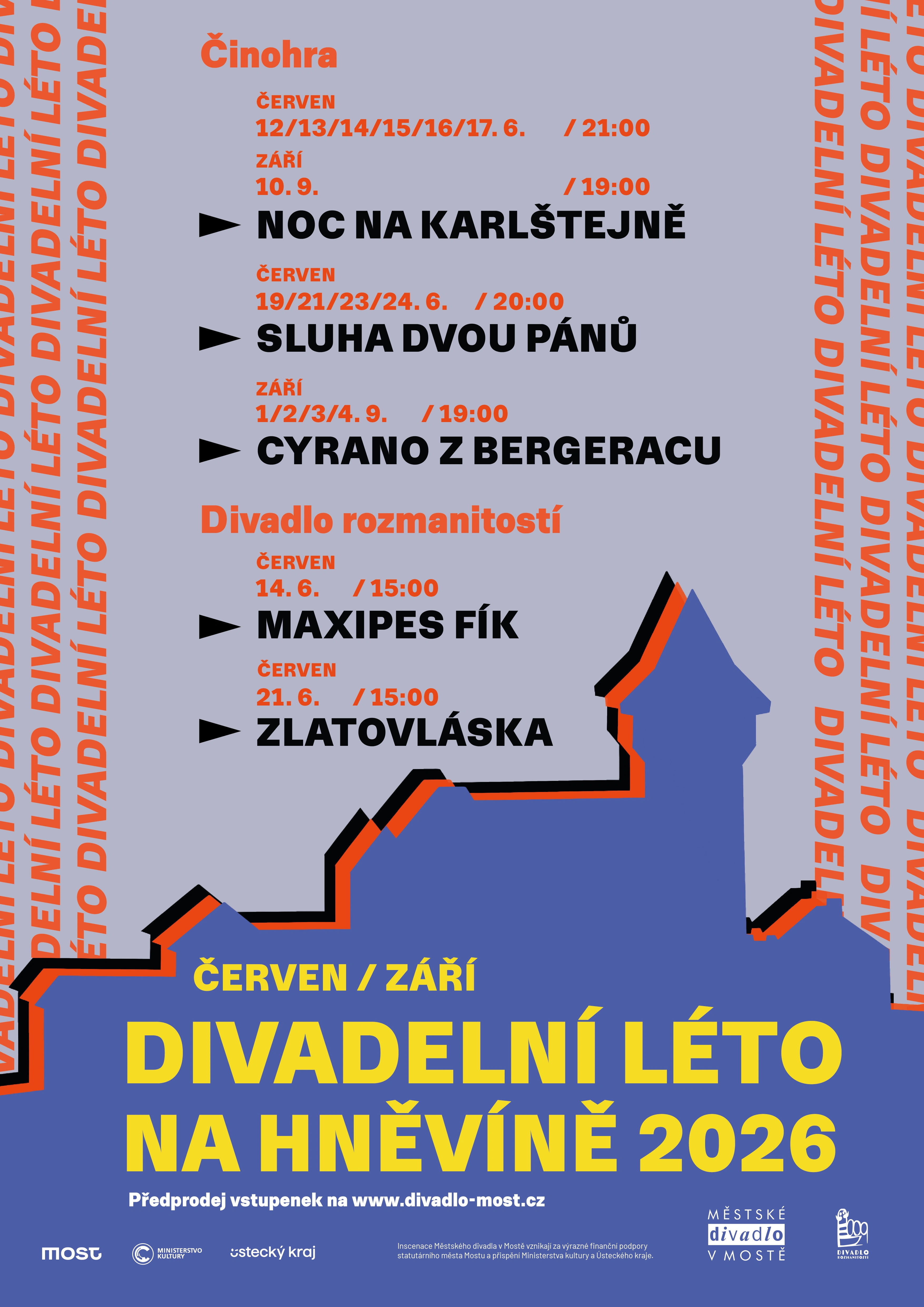 Most – Letní večery, výhled na město a divadelní prkna pod širým nebem. Městské divadlo v Mostě zahajuje už jedenáctý ročník oblíbené open-air akce Divadelní léto na Hněvíně. Letošní program sází na prověřené hity, ale poprvé na hradní nádvoří přivádí i slavného nosáče z Bergeracu.