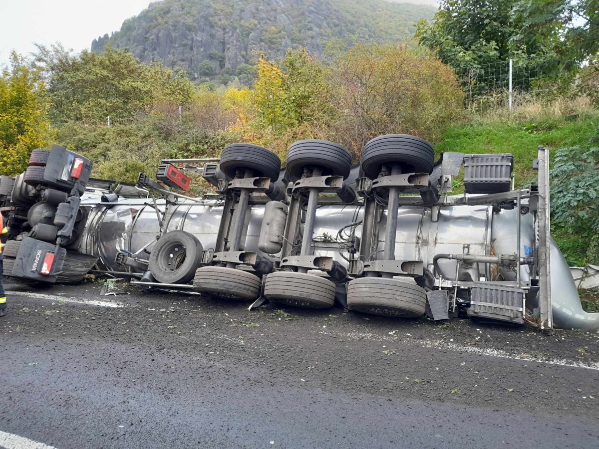 Mostecko – Včerejší nehoda cisterny převážející asfalt stále komplikuje dopravu na silnici I/13 ve směru z Mostu na Bílinu. Od odpoledních hodin probíhá přečerpávání obsahu cisterny. Ještě dnes by mělo dojít k vyproštění havarovaného vozu.