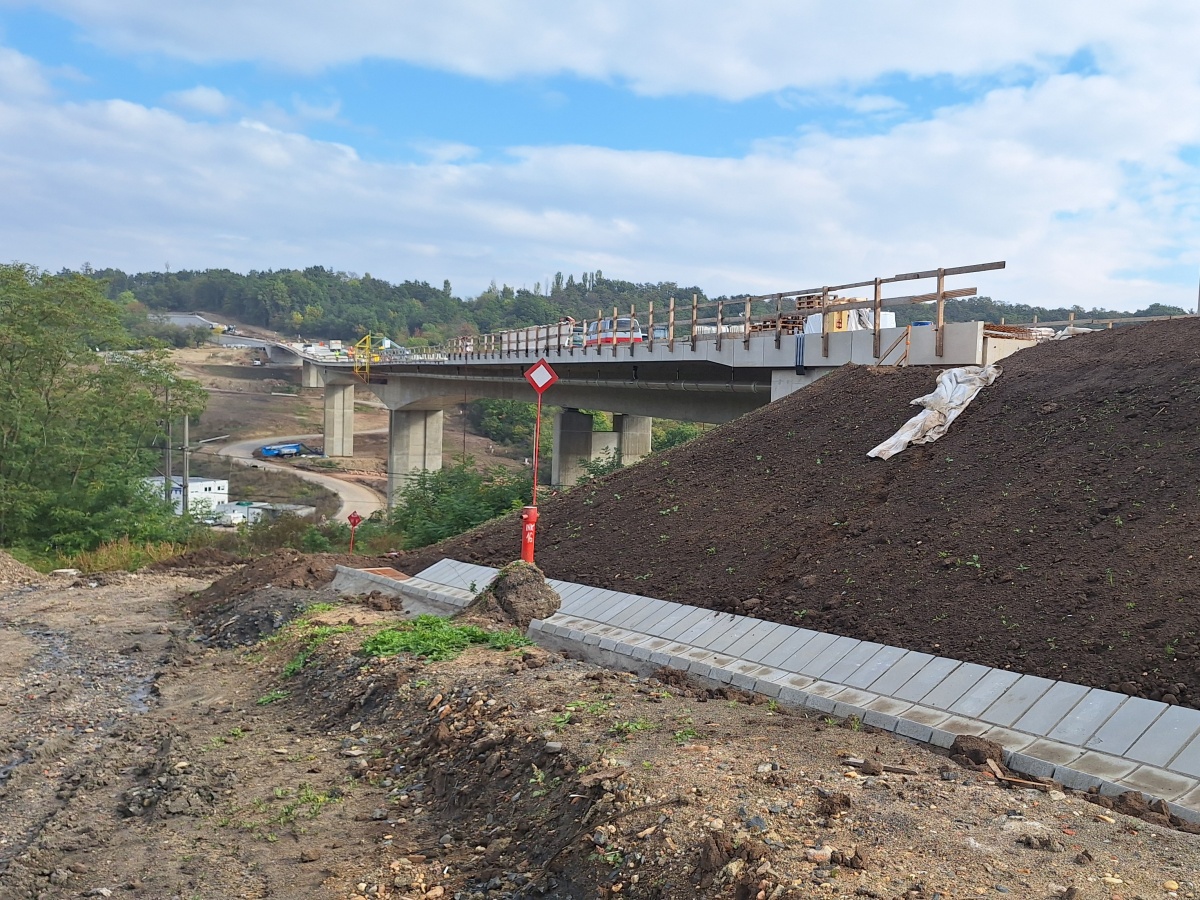 Žiželice – Čas, kdy budou moci motoristé opět bez objížděk jet z Mostu do Žatce po silnici I/27, se nezadržitelně blíží. Působivý 380 m dlouhý most přes údolí Hutná se již nyní tyčí až 30 m nad potokem.