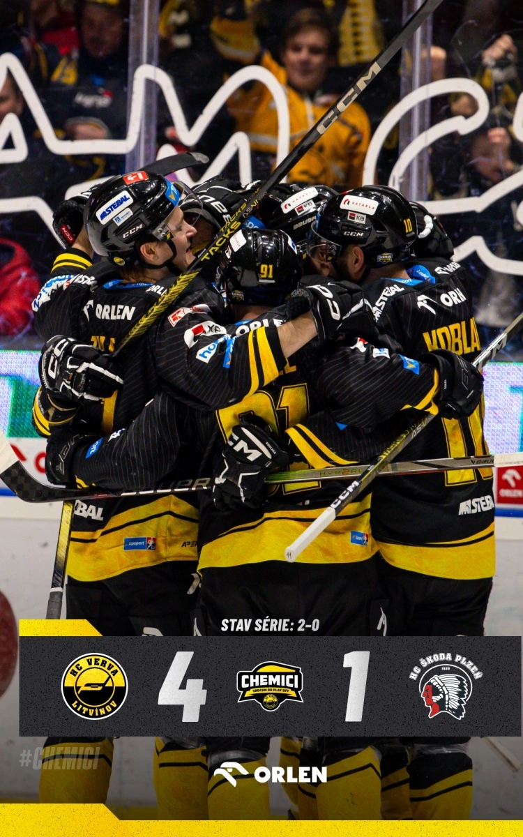 Po čtvrtečním vítězství vedou Litvínovští nad Plzní v sérii 2:0. V sobotu tak mohou postoupit do čtvrtfinále. Zdroj: HC Verva Litvínov