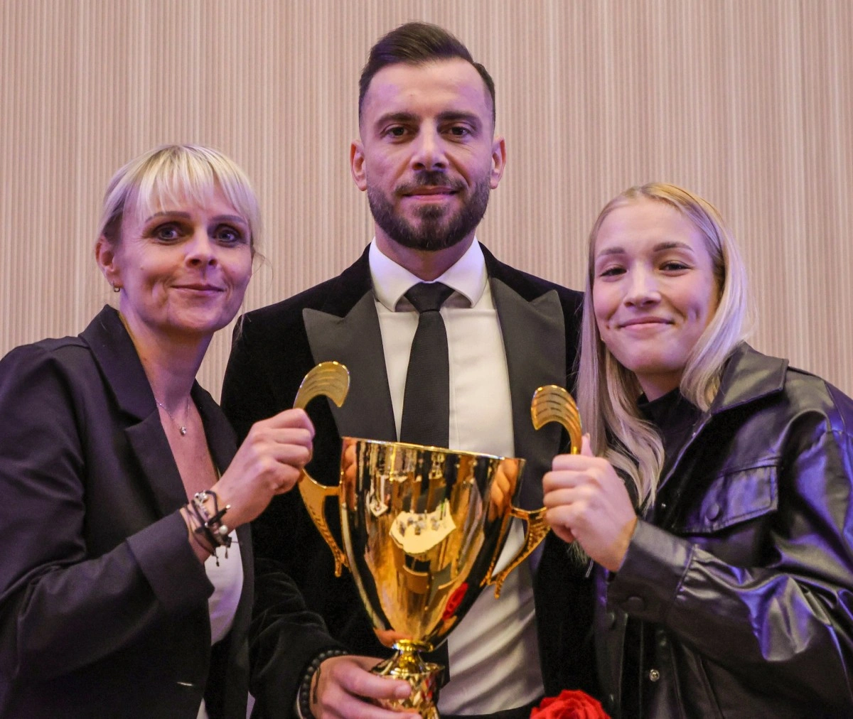 Na slavnostním vyhlášení nechyběl ani primátor Mostu Marek Hrvol, který tak mohl patřit mezi první gratulantky mosteckým házenkářkám. Foto: Jan Pimper
