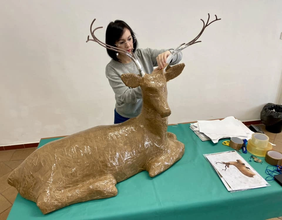 Miluška Dvořáková při výrobě jelena. Ten od pátečního poledne zdobí společně s dalšími lesními zvířátky prostor pod lípou na nádvoří zámku.