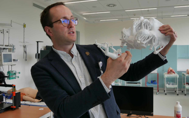„Co 3D tisk v předoperačním plánování v praxi znamená? Lékař si na tiskárně podle dat z (počítačové tomografie) může vytisknout v rámci předoperačního plánování část těla, kterou plánuje operovat, například poškozenou či deformovanou kost: obratel, pánev, lebku nebo třeba nádorové či zánětlivé ložisko uvnitř orgánu či kosti. Na ní si chirurg může ještě před operací vyzkoušet plánovanou terapii, může si vizualizovat jinak nedostupné struktury, eventuálně zjistit přesně jejich vztah ke zdravé, respektive nepoškozené tkáni. Podle zahraničních studií tato praxe snižuje operační čas a množství komplikací v chirurgii. Při rozšíření po České republice přináší metoda velký potenciál pro lékaře chirurgických oborů a tím zejména benefit pro pacienty: prokazatelné snížení krevní ztráty, zkrácení doby operace a rychlejší rekonvalescenci. Také umožňuje provedení menších operačních intervencí vzhledem k předoperačně vyzkoušené simulaci," přibližuje výhody 3D tisku v medicíně MUDr. Tomáš Novotný, Ph.D., MBA.