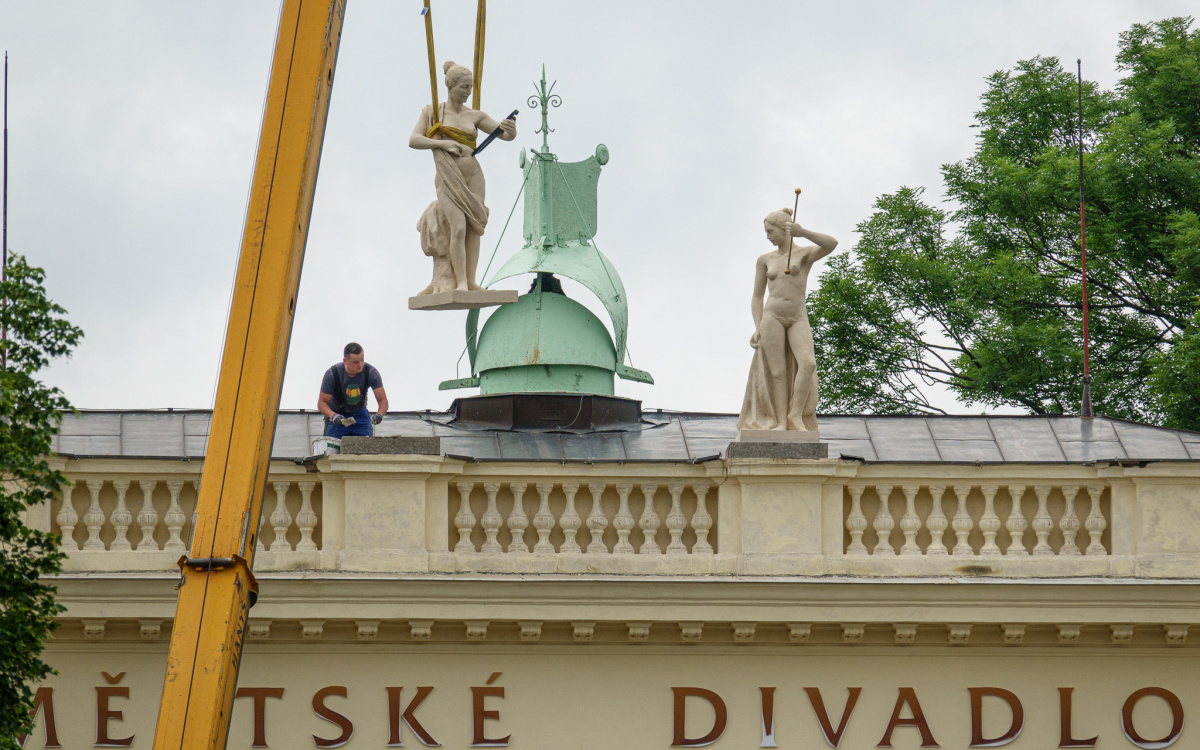 Střechu Městského divadla konečně zdobí alespoň dvě múzy. Každá váží 1,2 tuny. Foto: město Chomutov