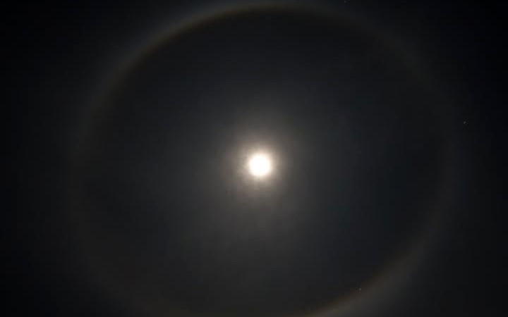 Onen prstenec kolem měsíce je tzv. halový jev. Co je k němu potřeba, abyste mohli prstenec vidět? Nacházet se na místě, kde se na vámi na obloze vyskytují hustá oblaka typu cirrostratus, tedy hustější oblačná přikrývka tvořená ledovými krystalky, v nichž se sluneční světlo láme, nebo odráží.