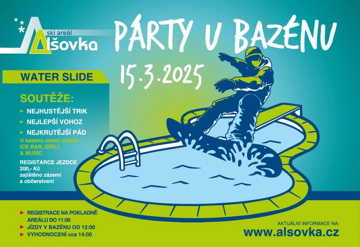 Veselo ale ve stejné datum, tedy 15. března bude i ve Skiareálu Alšovka. Tam chystají velmi oblíbenou párty u bazénu... ano stále tu mluvíme o lyžování. Kdo tuto akci zažil, už ví, že jde o neskutečnou podívanou. Jezdce totiž na konci trati čeká přejezd přes jezírko (tak ještě že se nám oteplilo). Soutěžit se bude v kategoriích nejhustější trik, nejlepší vohoz a nejkrutější pád. Kdo se chce bláznivé show zúčastnit, bude se moci registrovat u pokladny do 11 hodin. Jízdy do bazénu odstartují v pravé poledne.