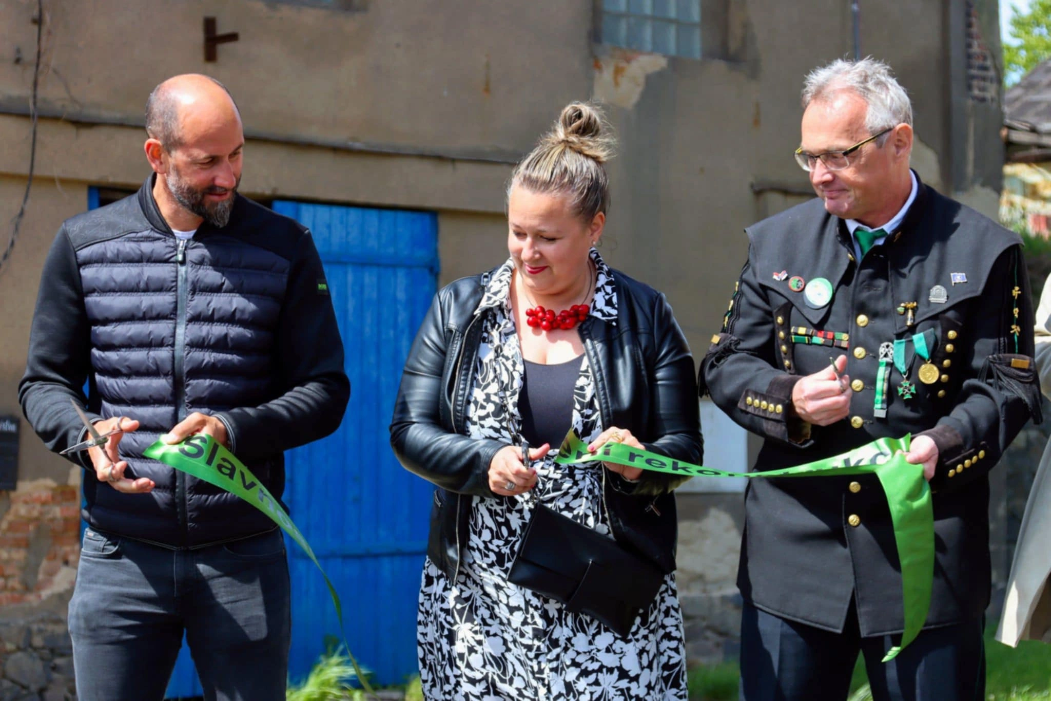 Slavnostní zahájení rekonstrukce těžní věže se uskutečnilo v pondělí 5. května. U stříhání pásky nechyběl senátor Jan Paparega, náměstkyně primátora Mostu Markéta Stará a ředitel muzea Zbyněk Jakš. Foto: město Most