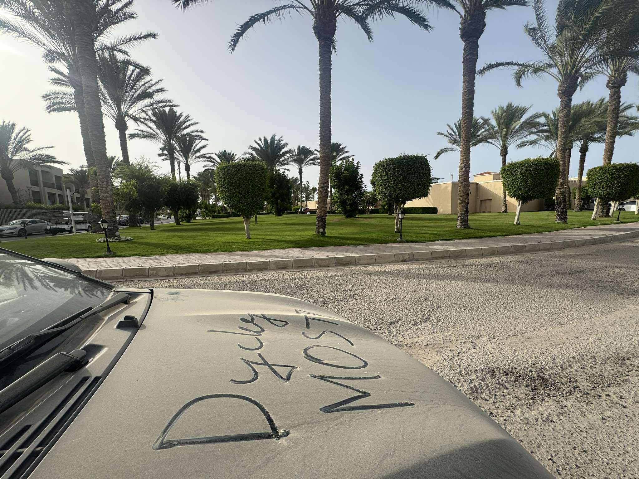 Legendární hláška ze Seriálu Most se objevila v písečném prachu na voze v letovisku v Egyptě. Foto: redakce