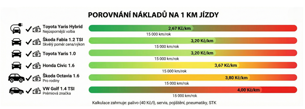 Toyota Yaris Hybrid je nejúspornější volbou s náklady 2,67 Kč/km (40 000 Kč ročně při 15 000 km). Škoda Fabia 1.2 TSI nabízí nejlepší poměr cena/výkon s náklady 3,20 Kč/km (48 000 Kč ročně) a širokou síť servisů po celém Česku.