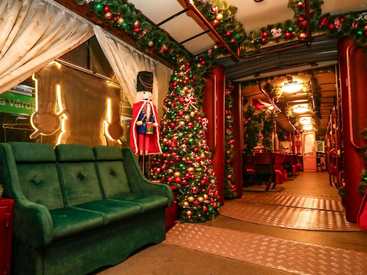 Interiér vánoční tramvaje v maďarském Miskolci. Fotozdroj: MHD86.cz