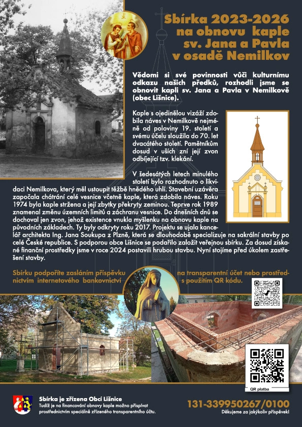 Mostecko – Měla ustoupit těžbě uhlí, stejně jako desítky jiných památek na Mostecku. Kaple sv. Jana a Pavla v osadě Nemilkov byla v sedmdesátých letech srovnána se zemí. Díky partě nadšenců a obci Lišnice se však vrací na své původní místo. Hrubá stavba repliky je hotová, nyní ale iniciátoři prosí veřejnost o pomoc s další fází – kapli je potřeba zastřešit.