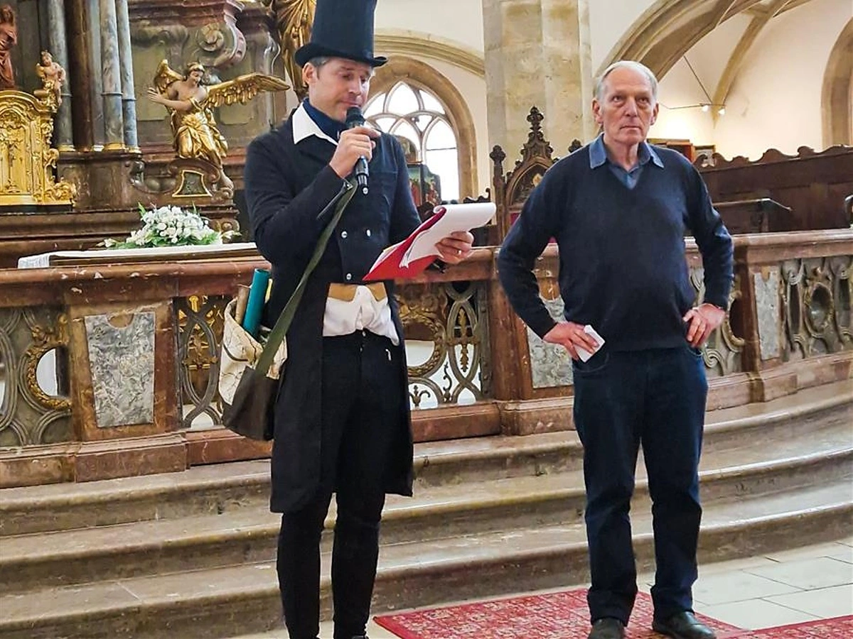 Jan Klápště (na foto vpravo) při vzpomínkové akci na stěhování děkanského kostela. Foto: město Most