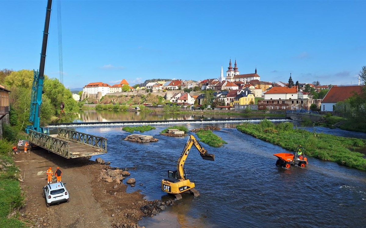 Kadaň – V pátek začali dělníci pracovat na rekonstrukci 108 metrů dlouhého jezu v Kadani na řece Ohři. Hned první den provedli osazení první a nejdelší části mostního provizoria za pomoci jeřábu. Čtyřpólový celokovový most o hmotnosti 55 tun bude dlouhý celkem 54 metrů s nosností 50 tun a bude sloužit pro pohyb těžké stavební techniky.